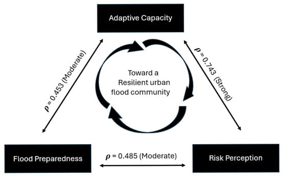 Urban communities possess strong social connections and are eager to utilise technology to manage flood risks effectively. However, they face significant challenges due to a lack of institutional and policy support, as well as limited resources. The significant positive correlations among flood preparedness, risk perception, and adaptive capacity imply that they are closely interconnected in shaping urban flood resilience. The strong link between risk perception and adaptive capacity suggests that when individuals clearly understand the risks, they are more likely to take adaptive actions. Meanwhile, the moderate relationships with preparedness indicate that while communities are taking steps to get ready, their actions are more effective when paired with awareness and institutional support. These findings underscore the need for integrated strategies that not only promote preparedness but also foster an understanding of risk and supportive systems to facilitate long-term adaptation.
