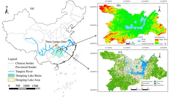 Location and topography of the Dongting Lake Region, China. (a) Location of the study area; (b) spatial distribution of the elevation; (c) land-use classification in 2020.