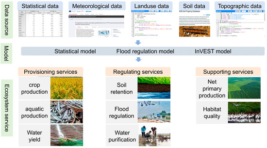 The Dongting Lake region, connected to the Yangtze River, has developed a range of vital ecosystem services—including robust flood regulation, food supply, and rich biodiversity—shaped by its unique geographical location and geological origins. Based on these features, and balancing data availability with the spatio-temporal resolution required for robust quantification, we selected eight specific services to capture the region’s key ecological functions: crop production, aquatic production, water yield, soil retention, flood regulation, water purification, net primary productivity (NPP), and habitat quality. The general framework for assessing the ecosystem services in the Dongting Lake region from 2000 to 2020 is shown in Figure 2.