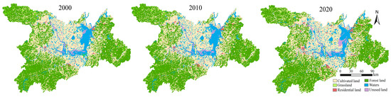 During 2000–2020, cultivated land areas declined the most, followed by water bodies and grasslands (Table 2). Cultivated land was mainly converted into forest land (3540 km2) and water bodies (1086 km2). Water bodies were predominantly transformed into cultivated land (1205 km2), and grasslands were predominantly transformed into forest land (335 km2). In addition, from 2000 to 2020, the residential land area increased the most, followed by unused and forest land (Table 2).