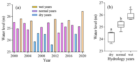 The water level of Dongting Lake fluctuated during 2000–2020, ranging from 23.61 to 26.44 m. Dry years were 2006, 2007, 2009, 2011, and 2018, and wet years were 2002, 2005, 2012, 2016, and 2020 (Figure 4a). Furthermore, water level differed significantly among the different hydrological years (p < 0.05), with average levels of 24.22, 25.18, and 25.87 m in dry, normal, and wet years, respectively (Figure 4b).
