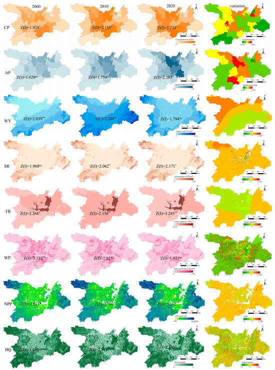 Spatiotemporal distribution and variations in ecosystem services in Dongting Lake Region from 2000 to 2020. Z(I) was used to measure the significance of spatial autocorrelation. Significance levels: ns p > 0.05, * p < 0.05, ** p < 0.01.