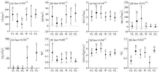 Comparison of ecosystem services under the different land-use types. Different letters indicate significant differences at the 0.05 significance level; lucc is the degree of explanation of spatial heterogeneity of ecosystem services by land-use type in the Dongting Lake Region. CL, cultivated land; FL, forest land; GL, grassland; W, waters; RL, residential land; UL, unused land. Significance levels: ** p < 0.01, and *** p < 0.001.