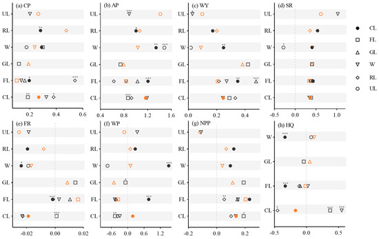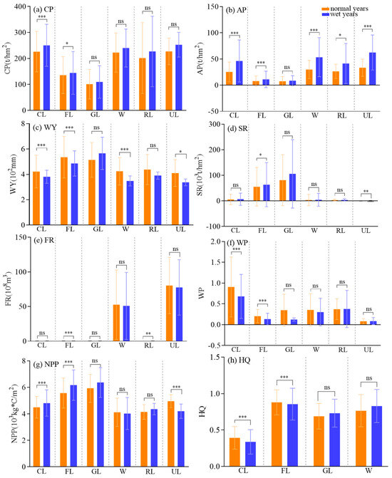 CP and NPP in croplands and woodlands were higher in wet years than in normal years, whereas WP and HQ exhibited the opposite trend (Figure 8a,f–h). AP was significantly higher in wet years than in normal years for all land types except grassland (Figure 8b). SR in forest and unused land was significantly higher in wet years than in normal years (Figure 8d). WY was significantly higher in normal years than in wet years for cropland, forest land, watersheds, and unused land (Figure 8c). FR was higher in normal years than in wet years in forested and residential land (Figure 8e).