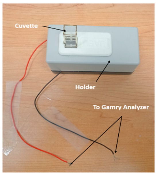 Electrical measurements were carried out by introducing 500 μL of each sample into a cuvette interfaced with a Gamry 3000 system (Gamry, Warminster, PA, USA). The impedance magnitude and phase were recorded across a frequency range spanning 10 Hz to 1 MHz, using a 10 mV AC excitation signal. Within this range, the phase of the impedance profiles revealed resonance frequencies between 50 Hz and 500 Hz. These variations in resonance behavior reflect the influence of differing ionic concentrations within the water suspensions. In this experiment, a two-electrode setup was used to analyze a cuvette containing a suspension, which was treated as a dielectric material. The cuvette dimensions were 10 mm × 21 mm × 4 mm. It features embedded polished aluminum plate electrodes [30]. The polished aluminum electrodes effectively reduce static electricity and minimize electrical arcing. The experimental setup is shown in Figure 1. The cuvette functions as a low-frequency, open-ended, parallel-plate sensor. The water samples were tested at a controlled room temperature of approximately 27 °C during the measurements.
