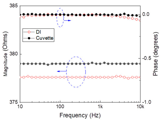 As a reference, EIS measurements were conducted on the clean empty cuvette and deionized water with an ohmic resistance of 18.2 MΩ·cm and a conductivity of 0.05 μS/cm. As anticipated, the electrical impedance measurements for both the empty cuvette and when it is filled with deionized water are similar, as shown in Figure 2. This confirms the effectiveness of the proposed method and the accuracy of the measurements. The integrated cuvette and holder system exhibit predominantly resistive behavior, which is advantageous for sensing applications. This configuration enables the detection of minor ionic concentration changes in water, thereby enhancing the selectivity and sensitivity of the measurements.
