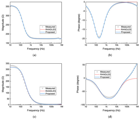 Measurements and circuit performance: (a,b) show the impedance magnitude and phase of the Evian sample, respectively, superimposed with the performance curves of the Randles model and the modified equivalent circuit model. (c,d) present the impedance magnitude and phase of the SW3 sample, respectively, superimposed with the performance curves of the Randles model and the modified equivalent circuit model.