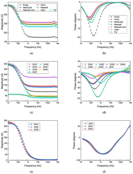 Measured electrical impedance as a function of frequency: (a) magnitude for bottled water, (b) phase for bottled water, (c) magnitude for groundwater samples, (d) phase for groundwater samples, (e) magnitude for seawater samples, and (f) phase for seawater samples.