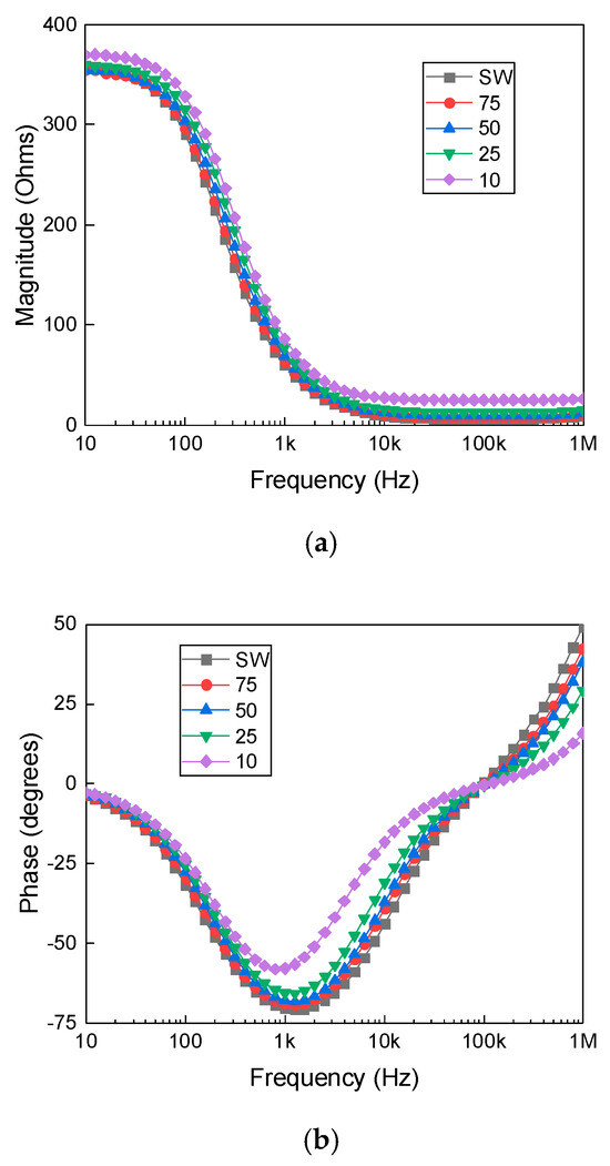 Impedance magnitude (a) and phase (b) as a function of frequency for seawater (SW) and its dilutions with deionized water at 75%, 50%, 25%, and 10% concentrations.