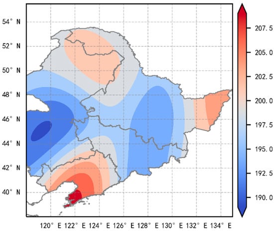 Under the influence of the East Asian summer monsoon, the monsoon rain belt moves northward to north and northeast China during July and August, establishing the regional rainy season [26,27]. The spatial pattern of the climatological mean onset date (Figure 1) was derived from station observations across 66 sites over 1961–2020. The earliest onset occurs in the southwestern region, with the earliest areas before day 190 (9 July). In contrast, the Liaodong Peninsula exhibits the latest onset, typically after day 207 (26 July). Provincially, Liaoning and Heilongjiang Provinces have the most pronounced difference in onset timing. Notably, within Liaoning Province itself, the onset dates varied by more than 12 days, with the majority of areas after day 202 (21 July). In contrast, Jilin displays relatively uniform onset sequences, confined within a 10-day window. Overall, the RSOD in NEC exhibits marked spatial heterogeneity, which gradually shifts from the southwest and southeast toward other regions, such as the north and east.