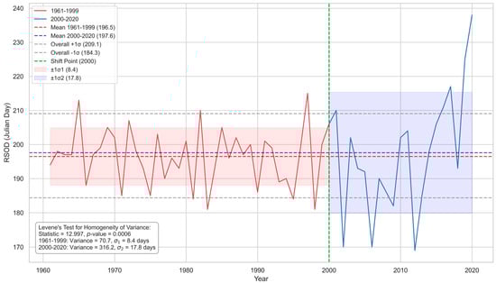 RSOD interannual variability in northeast China (1961–2020). Time series of rainy season onset dates (day of year) for 1961–1999 (red) and 2000–2020 (blue), with period-specific means (dashed lines), ±1σ ranges (shaded areas), and overall variability (gray dashed lines). Statistical results from Levene’s test for variance homogeneity are annotated.