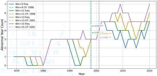 Time series of the RSOD abnormal-year frequency (±1σ) computed using a moving window. Dashed vertical lines indicate the change points detected by the Pettitt test for different window sizes (9–15 years), all converging between 1998 and 2001. *** means p < 0.001.