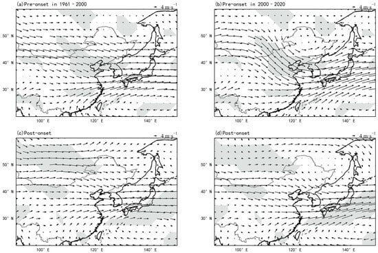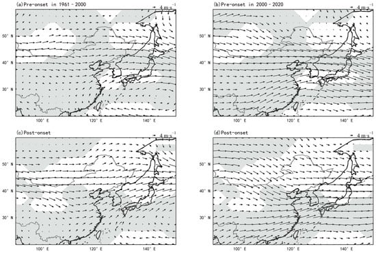 Composite 10-day wind patterns (vectors: wind speed; shade: regions exceeding 95% confidence level) during early RSOD. (a) Pre-onset (1961–2000); (b) Pre-onset (2000–2020); (c) Post-onset (1961–2000); (d) Post-onset (2000–2020).