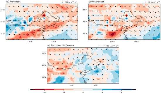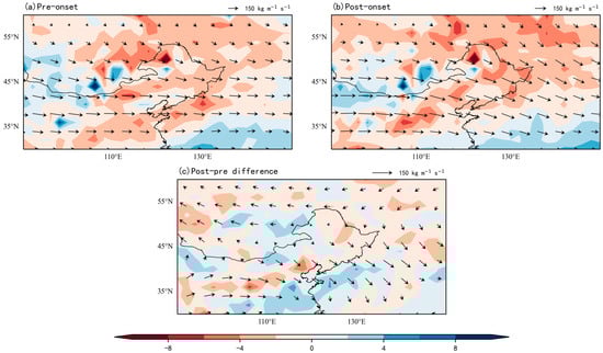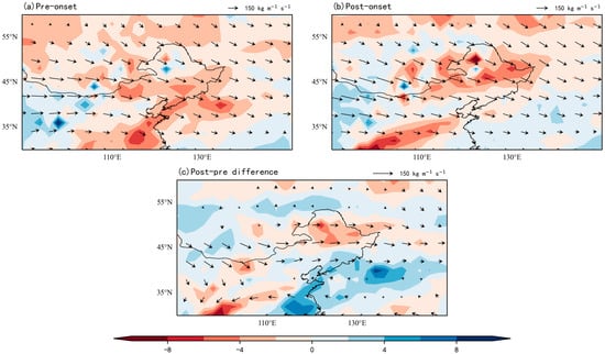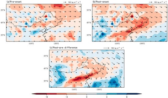 Composite water vapor flux (vectors: kg m−1 s−1) and divergence (shade: 10−5 kg m−2 s−1) during early RSOD (2000–2020). (a) Pre-onset; (b) Post-onset; (c) Anomaly (Post-onset minus Pre-onset).