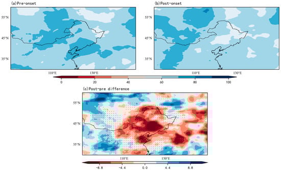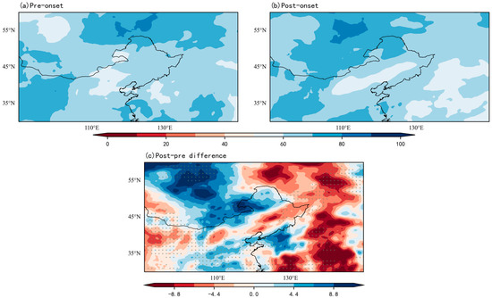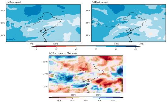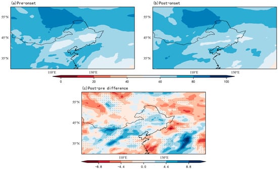 Composite RH (%) during the early RSOD (2000–2020). Stippling indicates regions exceeding the 95% confidence level. (a) Pre-onset; (b) Post-onset; (c) Anomaly (Post-onset minus Pre-onset).