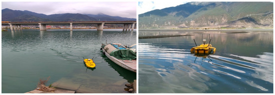 The unmanned vessel measurement system (Shanghai Huace Navigation Technology Co., Ltd., Shanghai, China) comprises four components: the hull, the communication system, the control system, and the data acquisition system. The hull serves as the carrier platform, and it is constructed from corrosion-resistant, lightweight, and high-strength materials. Propelled by stern-mounted dual propellers and powered by onboard lithium batteries, it ensures operational stability. The communication system facilitates bidirectional data transmission between the vessel and the base station. Through radio frequency point-to-point communication, it transmits real-time status, attitude, mission information, and measurement data (including bathymetry, flow velocity, and positioning). Centimeter-level positioning is achieved using an onboard real-time kinematic (RTK) (Shanghai Huace Navigation Technology Co., Ltd., Shanghai, China) rover paired with a reference station (shore-based or utilizing Continuously Operating Reference Station (CORS)). The control system features both autonomous and remote-operated modes, enabling route planning via electronic charts or manual intervention for complex scenarios. As the core component, the data acquisition system collects and records critical data (e.g., bathymetry and positioning) through onboard equipment, including sounders and Acoustic Doppler Current Profiler (ADCP) (Teledyne RD Instruments, Poway, CA, USA). This data is processed by software to provide foundational bathymetric information for topographic mapping.