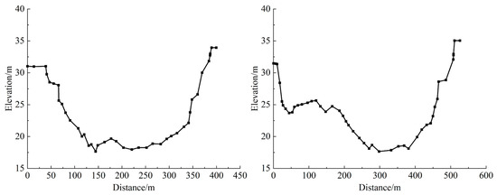 Underwater topographic surveying employed unmanned vessel bathymetry integrated with a centimeter-level accuracy RTK system that assessed Zhejiang CORS, which achieved horizontal and vertical accuracies of ±2 cm and ±3 cm, respectively. The workflow involved planning survey areas and deploying control points on electronic maps while avoiding signal obstructions, establishing a shore-based control center at open locations for equipment connection and parameter configuration (instruments, communication interfaces, and coordinate systems), and conducting initial measurements under manual control with real-time monitoring. Subsequent network RTK 3D bathymetric surveys utilized the GNSS receiver configured as an RTK rover paired with the sounder, exclusively applying fixed solutions. Post-processing refined raw data by eliminating spurious depths—defined here as outliers exceeding three standard deviations from the local depth mean—exported coordinate data to generate underwater topography, extracted river cross-sections using the Global Mapper 20.0 software, and supplemented embankment data through handheld RTK surveys. The field measurement of the river section is shown in