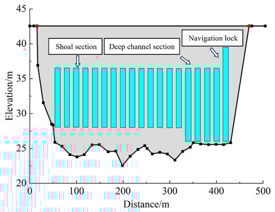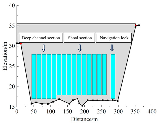 The downstream hydropower station has a dam crest elevation of 35.52 m with 15 spillway gates comprising five 12 m wide gates in the deep channel section at a gate sill elevation of 17.0 m, ten 12 m wide gates in the shoal section at a sill elevation of 18.0 m, and one 12 m wide navigation lock at a sill elevation of 17 m. The gate configuration model, which was established based on engineering design documents, is presented in