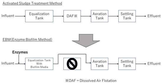 Figure 1, the authors have implemented the Enzyme Biofilm Method (EBM) for over 10 years to address these problems in food factory wastewater treatment facilities. EBM is a pretreatment method that does not require physicochemical treatments such as DAF and does not adversely affect biological treatment. EBM utilizes groups of enzymes in the initial stage to break down soluble organic matter in wastewater into low-molecular-weight compounds. This activates biofilms composed of endogenous microorganisms suspended in the water or attached to carriers, promoting organic matter decomposition. The advantages of EBM compared to the activated sludge method include compatibility with high-load wastewater without the need for physicochemical pretreatment, and its effectiveness even under high Biochemical Oxygen Demand (BOD) volumetric loads [