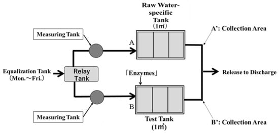 3 to which enzyme mixtures were added. Both the raw water-specific tank (A) and the test tank (B) were aerated at 30 L/min using a blower. The retention time in both tanks was 3 days. The daily flow rate was 333 L to match the retention time of the equalization tank. Enzyme mixtures were dripped into the test tank at a concentration of 10 mg/L relative to this daily flow rate using an automatic injection device. The water quality analysis parameter for verifying effectiveness was the BOD, following the Japanese Industrial Standards (JIS), since starch manufacturing wastewater was being treated. Samples from the raw water-specific tank and from the test tank were obtained every fourth Wednesday during the three-month test period.