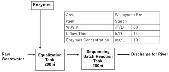 The maximum capacity of the equalization tank was 200 m3. With a daily inflow of approximately 60 m3, and considering water level fluctuations, the maximum effective volume was 180 m3, resulting in a retention time of 3 days. Enzyme mixtures were added to the equalization tank at a concentration of 10 mg/L relative to the daily inflow of approximately 60 m3. The discharge regulation values, given that the effluent is released into a river, are as follows: pH 5.8–8.6, BOD 120 mg/L, SS 150 mg/L, and n-Hexane (equivalent to FOG) 30 mg/L. As in the test plant study, the water quality analysis parameter for verifying the effectiveness of this treatment was BOD, following JIS.
