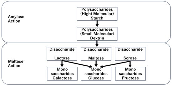 Verification 2: Two-Stage Evaluation of Starch Decomposition Capability: The above-described verification study confirmed that dripping enzyme mixtures reduced the inflow load to the sequencing batch reaction tank by decomposing soluble organic matter in the wastewater into medium- and low-molecular-weight compounds by utilizing the metabolic activity of endogenous microorganisms in the sequencing batch reaction tank. The main objective of this paper is to evaluate the fact that the BOD concentration in the equalization tank decreased due to the effect of enzyme addition. Therefore, at this stage, it is difficult to clearly demonstrate the effect of enzyme addition. However, that verification study did not evaluate whether the enzyme mixtures adequately decomposed starch-derived BOD compounds into low-molecular-weight compounds to support microbial metabolism. We therefore experimentally confirmed that the enzyme mixtures decomposed starch into low-molecular-weight compounds.