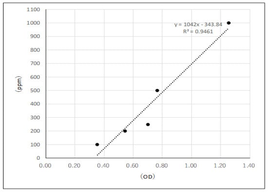 2 = 0.95 was prepared by measuring five concentrations (0.1%, 0.05%, 0.025%, 0.02%, and 0.01%) of starch–iodine solution at 670 nm and converting the absorbance to ppm (