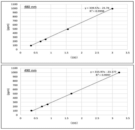 2 = 0.99 were prepared for both wavelengths by measuring five concentrations (0.1%, 0.05%, 0.025%, 0.02%, and 0.01%) of glucose solution and converting the absorbance to ppm (