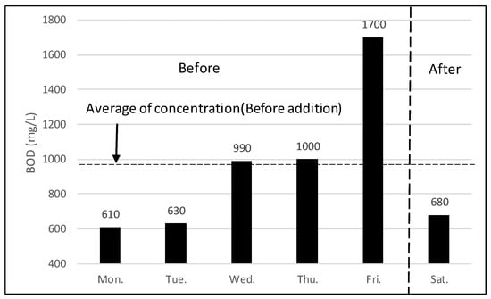 The daily water volume was consistently around 60 m3/day. The factory operated five days a week (Monday to Friday). The inflow load concentration from the equalization tank to the sequencing batch reaction tank fluctuated significantly, resulting in inconsistent treatment in the sequencing batch reaction tank. Before this verification experiment, the BOD of samples from the equalization tank (Monday to Friday) tended to increase as the weekend approached.