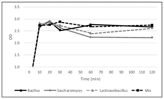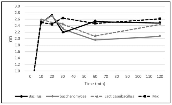 Bacillus-derived (2.89), and 30 min for 3-genera Mix (2.88). The OD measurements after 120 min at both wavelengths were highest for Mix, followed by the