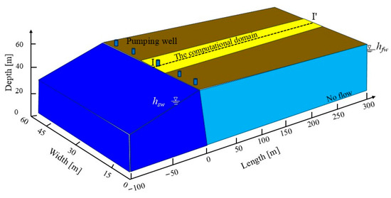 Schematic diagram of a three-dimensional site-scale conceptual model of a coastal aquifer. The left side represents the seaward boundary, while the right side corresponds to the inland freshwater boundary. The base of the model is defined by the impermeable confining layer. The blue cylinders denote the pumping wells. The yellow rectangular area indicates the computational domain, which extends to the base of the aquifer.