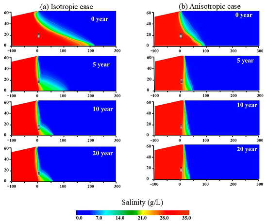 Salinity distribution within the aquifer after 0, 5, 10, and 20 years of operation of the negative hydraulic barrier comprising pumping wells with a pumping rate of 3 m3/d under isotropic (a) and anisotropic (b) conditions.