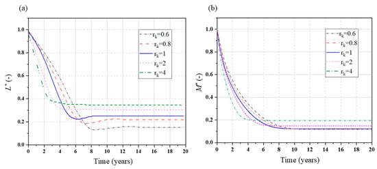 To quantify the impact of hydraulic anisotropy on removal effectiveness, Figure 3a shows how L* evolves over time under different rk. Initially, L* is set to 1. After the pumping wells are operational, for rk = 1, 0.8, 0.6, L* gradually decreases to minima of 0.21, 0.18, the 0.15 at 6, 7, the 8 years, respectively, then rebounds during an adjustment phase before stabilizing at 0.23, 0.21, the 0.17. This indicates that, in isotropic (rk = 1) and low-anisotropy ratios (rk < 1) aquifers, residual saltwater rapidly retreats seaward. The adjustment phase arises as the system rebalances its hydrodynamics and salinity distribution under constrained vertical transport. For rk = 2, 4, L* drops to minima of 0.38 and 0.35 at 3 and 4 years, respectively, and then stabilizes directly. In high-anisotropy ratio (rk > 1) aquifers, enhanced vertical hydraulic conductivity promotes vertical flow and mixing, enabling the rapid vertical dissipation of the saline wedge and eliminating the need for an adjustment phase. Results show that higher rk shortens the time to reach stabilization, but increases L*, implying lower effectiveness of the negative hydraulic barrier. The increased vertical hydraulic conductivity in high-rk aquifers allows for saltwater to migrate vertically more easily, reducing the barrier’s ability to contain saltwater vertically and thus increasing L* and lowering the barrier’s effectiveness.