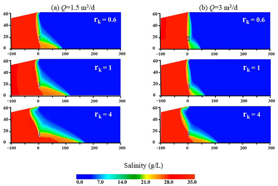 Salinity distribution in aquifers with varying anisotropy ratios (rk = 0.6, 1, and 4) under saline groundwater pumping conditions, with all pumping wells screened at 10 m depth and pumping rates of (a) 1.5 m3/d and (b) 3 m3/d.