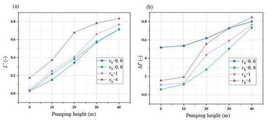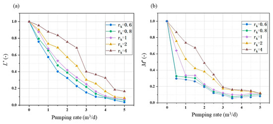 (a) The reduction rate of the saltwater wedge in the inland aquifer behind the pumping wells (L*), and (b) the total salt removal rate (M*) versus pumping heights under saline groundwater pumping conditions across varying anisotropy ratios (rk).