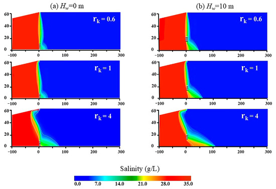 Salinity distribution in aquifers with varying anisotropy ratios (rk = 0.6, 1, and 4) under saline groundwater pumping conditions, with the position of the screening related to the bottom of the aquifer of (a) Hw = 0 m and (b) Hw = 10 m at a constant pumping rate of 3 m3/d. The time points shown are t = 20 years into Stage 2.