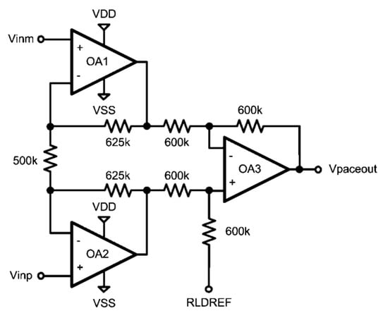 Signal amplification circuit of ADS1293. Amplifies weak biopotential signals (ECG) with programmable gain and noise reduction for wearable monitoring.