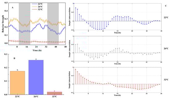 Behavioral dynamics of koi carp under thermal stress. (A) Real-time behavioral strength (solid line) with standard deviation (dashed shading) and dark periods (vertical bars). (B) Mean activity at 22 °C, 26 °C, and 32 °C (letters indicate statistical significance, p < 0.05; ANOVA). (C) Autocorrelation analysis of activity patterns across temperatures.