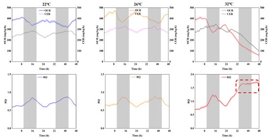 Respiratory dynamics of koi carp under thermal stress. Upper figures: oxygen consumption rate (OCR) and CO2 excretion rate (CER) trajectories. Solid lines: real-time data; shaded areas: ±1SD; vertical bars: dark periods. Lower panels: respiratory quotient (RQ) rhythms. Dashed boxes highlight disrupted diurnal patterns at 32 °C.