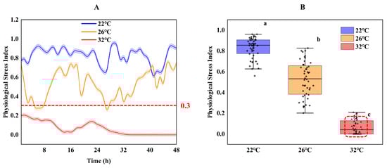 Physiological Stress Index (PSI) dynamics during thermal exposure. (A) Temporal PSI variation at 22 °C (control), 26 °C (moderate stress), and 32 °C (acute stress). Solid lines: group means; shading: ±1 SD. A red dashed line at PSI = 0.3 indicates the threshold value. (B) Distribution of PSI values across temperature groups. Boxes: IQR; horizontal lines: medians. Outliers are highlighted with red circles. Statistical differences among groups are denoted by different letters (a, b, c), where each letter represents a significant difference from the others.