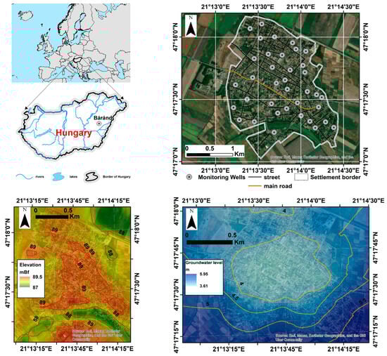 Báránd is located in the eastern part of Hungary in Europe. The settlement is situated in the Nagy–Sárrét microregion, which is part of the Great Hungarian Plain (Figure 1). The population of Báránd was approximately 2500 in 2022 [33]. The flat plain’s altitude is generally between 85 and 89 m above sea level, with a relative relief of 0–3 m/km2. The direction of regional groundwater flow is from north to south. The groundwater level is close to the surface (1–5 m). According to the World Reference Base for Soil Resources (WRB), the prevailing Reference Soil Groups are Solonetz, Vertisols, Kastanozems, and Chernozems; in residential zones, anthropogenic alteration has produced Anthrosols and Technosols [34]. The study area is predominantly composed of Late Holocene and Late Pleistocene fluvial sediments, consisting mainly of clay and silt, with interbedded alluvial sand layers, while the prevailing soil texture is characterized by loam and clay loam. The region experiences an average annual precipitation of 520–540 mm and is characterized by a moderately warm and dry climate, classified as Cfb according to the Köppen climate classification system [35].