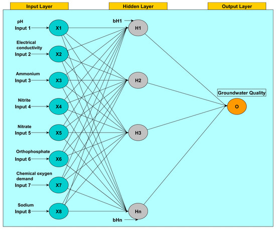 To evaluate the performances of the water quality indicators, a Feed-Forward Neural Network (FFNN) was created. The FFNN graph model is a controlled teach-in feed-forward neural network realizing a controlled training that contains three layers: an input layer (pH, EC, NH4+, NO2−, NO3−, PO43−, COD, Na+), a hidden layer, and an output layer (water quality status based on the WQI and CCME WQI; degree of contamination based on the Cd index). The front-coupled network means that the signal flows from left to right; i.e., the input of a given layer neuron will be the output of the layer neuron to its left; i.e., the graph theoretical representation of the network does not contain any loop [45,46] (Figure 3).