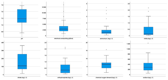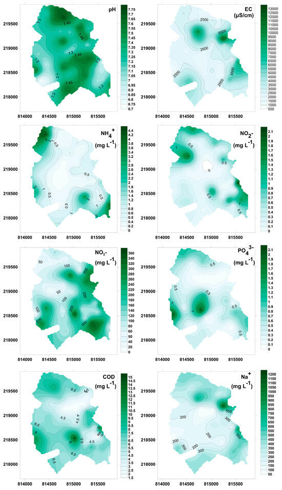 In our research, 37 dug groundwater wells were investigated in the study area. Water samples were collected from each well’s upper 1 m water column. The pH and electrical conductivity (EC) values of the samples were measured with a WTW 315i meter; the collected water samples, ammonium (NH4+), nitrite (NO2−), nitrate (NO3−), and orthophosphate (PO43−) were determined by a spectrophotometer according to HS ISO 7150-1:1992, HS 448-18:2009, and HS 1484-13:2009. The chemical oxygen demand (COD) was determined using the KMnO4 method and sodium (Na+) with the PerkinElmer 3110 AAS instrument (Shelton, CT, USA). Water samples were analyzed according to HS 21464:1998 [40] after extraction of three times the well volume using a peristaltic pump and recorded [41,42,43].
