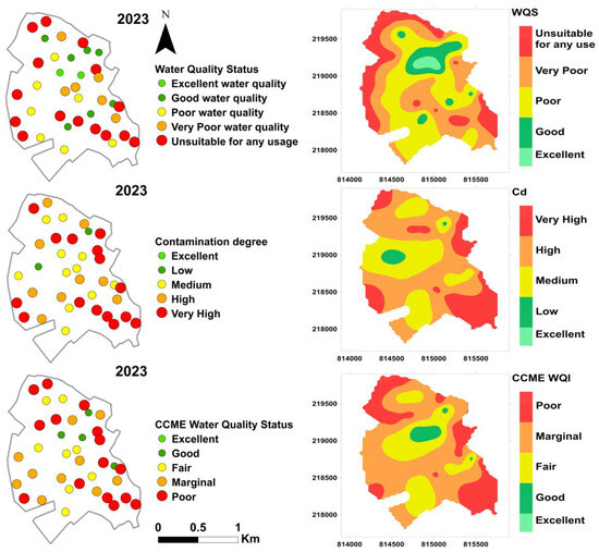 Spatial distribution of water quality status according to the indices in 2023.