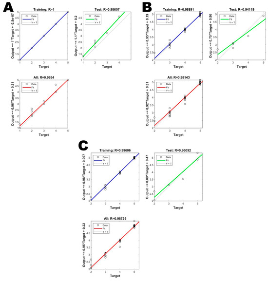 When using neural networks, the sample set was randomly divided into three subsets (training set: 70%; test set: 15%; validation: 15%). The performances and generalization abilities of the models fundamentally depended on the definition of these sets [45].
