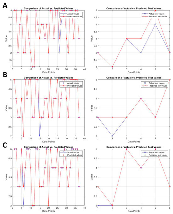 For each model, FFNN predictions for the test set of experimental data samples for the (A) WQI, (B) Cd, and (C) CCME WQI.