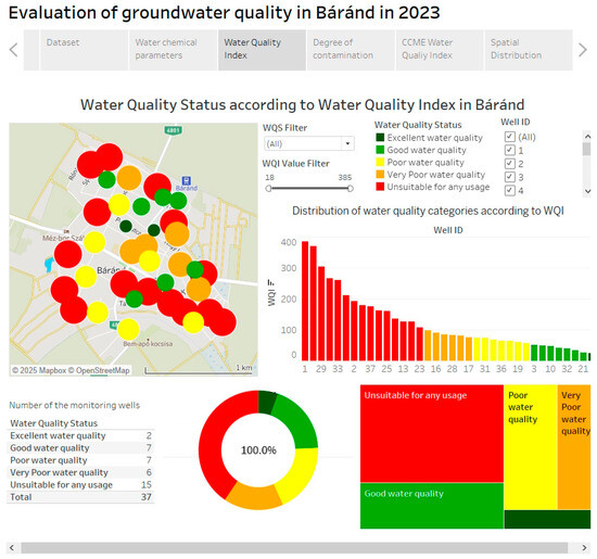 According to the Cd index developed by Backman et al. to assess the degree of contamination, 64.86% of the examined groundwater wells were classified as Very High and High. Furthermore, 29.73% of the groundwater wells are considered moderately contaminated, and only 5.41% of the wells have a low degree of contamination (Low). The CCME WQI, which is an improved version of the traditional WQI, rated 67.57% of the groundwater wells as contaminated (Poor, Marginal), while the proportion of categories indicating already adequate water quality (Good, Fair) was 32.43%.