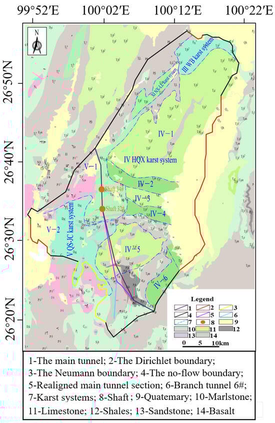The modeled tunnel section spans a total length of 31.478 km, primarily traversing the Heqing Xishan (HQX) karst system and the Qingshui–Jianchuan (QS-JC) karst system. The model incorporates the newly added Shaft 32#, Shaft 34#, Branch tunnel 6#, and realigns the main tunnel section. The area encompassed by the model, defined by the hydrogeological boundaries of the karst systems associated with the tunnel, is illustrated in Figure 1.