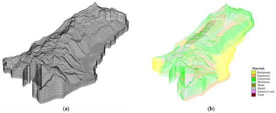 Schematic diagram of meshing and lithology division of the study area. (a) Meshing—5× magnification vertically. (b) Lithological three-dimensional zoning.