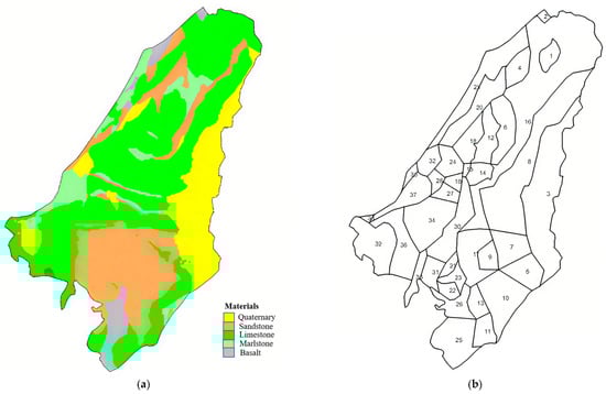 Zone of rainfall infiltration taking into account lithology and topography. (a) Lithologic zone of the study area. (b) Rainfall infiltration zone in the study area (numbers indicate zone IDs).
